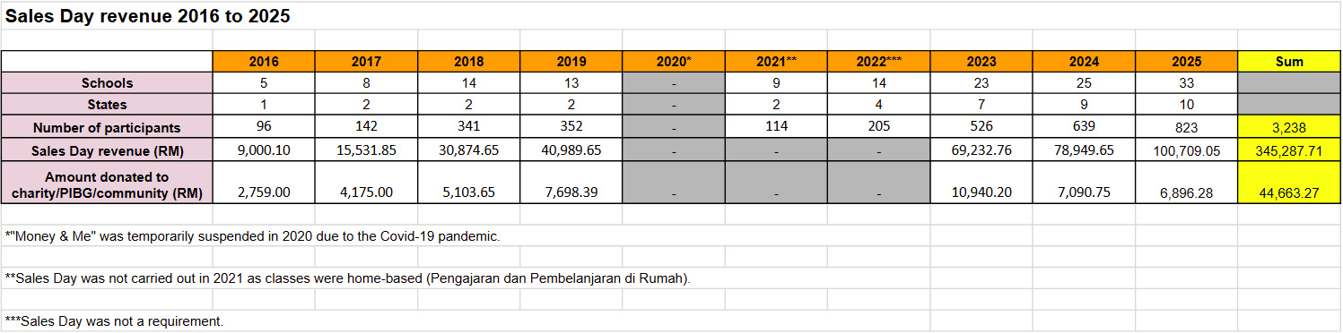 Before the Covid-19 pandemic struck in 2020, Money & Me participants were required to put their business plans into action on “Sales Day”, a half-day or one-day event at schools where students sold their products or services. Between 2016 when the programme was launched and 2019, Money & Me participants earned RM96,396 from Sales Day and donated almost a quarter of the total to charity. Among the beneficiaries were the PIBG or PTA in participating schools which then channelled the funds to B40 students in the respective schools. Other beneficiaries included orphanages and the homeless.